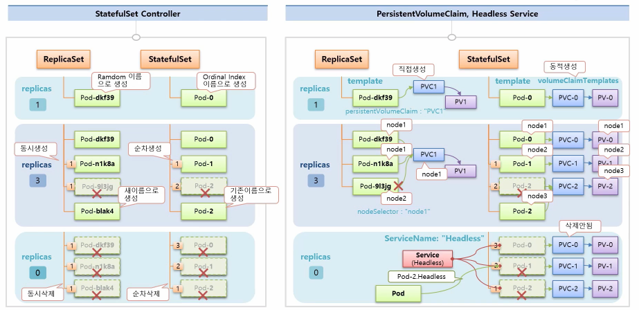 : ReplicaSet은 Pod의 Volume을 연결하려면 PVC를 별도로 직접 생성을 해놓아야 합니다. 이후 ReplicaSet을 만들면 템플릿에 Pod 내용의 PVC으로 PVC1을 지정해놓기 때문에 바로 연결이 됩니다. 하지만 StatefulSet의 경우 템플릿을 통해 Pod가 만들어지고, 추가적으로 volumeClaimTemplates가 있는데, 이것을 통해 PVC가 동적으로 생성이 되고 Pod와도 바로 연결이 됩니다.