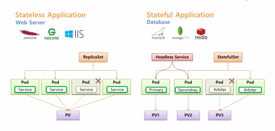 Stateless는 앱이 여러개 배포되더라도 다 똑같은 서비스의 역할을 합니다. Stateful은 각각의 앱마다 자신의 역할이 있습니다. 몽고 DB 경우를 보면 하나는 Primary 역할, 또 하나는 Secondary, 그리고 Arbiter 역할이 있습니다. Primary는 Main DB이고, 이가 죽으면 Arbiter가 이것을 감지해서 Secondary가 대신 역할을 할 수 있도록 변경해줍니다.