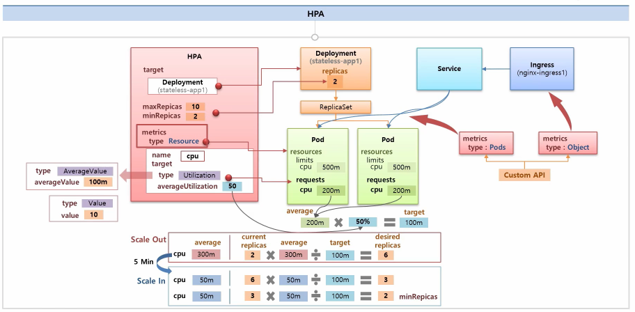 : Replicas를 2로 Deployment를 만들면 ReplicaSet이 만들어지면서 Pod를 2개 생성이 됩니다. Pod의 리소스 Limit, Requests가 위처럼 설정되어 있는 상태에서 이것을 Scale in/out 하는 HPA를 만들겠습니다. 먼저 target Controller를 지정하는 부분이 있고, 증감되는 Replicas에 대해 min과 max를 지정해야 합니다. metrics는 매트릭 정보에 어떤 조건을 통해서 Replicas를 증가시킬지에 대한 부분인데 type이라고 해서 Resource라고 선택하면 이 Pod의 Resource 부분을 가리킵니다. 세부적으로는 Memory, CPU를 볼건지 정할 수 있습니다. 마지막으로 어떤 조건으로 증가시킬지에 대한 부분인데 가장 기본으로 사용되는 옵션인 Utilization이 있고, 평균 50%라고 했다면, 이 Pod의 Request 값을 기준으로 현재 사용자원이 평균 50%가 넘으면 Replicas를 증가시킵니다. 이 수치를 넘으면 무조건 하나씩 무조건 1개씩 Pod가 만들어지는 것은 아니고, 정해진 공식을 가지고 한 번에 몇 개를 증가시킬지 결정이 되는데 계산해봅시다.