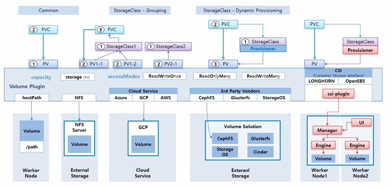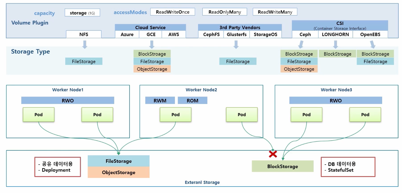 각각 볼륨마다 Storage Type이 있습니다. NFS는 전형적인 FileStorage, Cloud Service는 여러 볼륨 솔루션들이 있기 때문에 대부분 BolockStorage, FlieStorage, ObjectStorage 모두 지원합니다. 그리고 현재 k8s에 플러그인 되어 있는 3rd Party Venders는 대부분 FileStorage를 지원하고 있습니다. 마지막으로 CSI는 새롭게 컨테이너 베이스로 볼륨 솔루션을 설치할 경우 모든 Storage 타입이 제공 가능합니다. 다른 솔루션들은 각자의 특성에 맞게 스토리지 타입을 제공합니다.