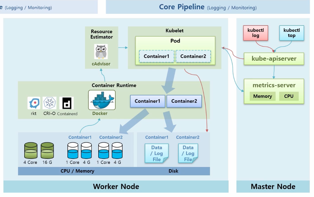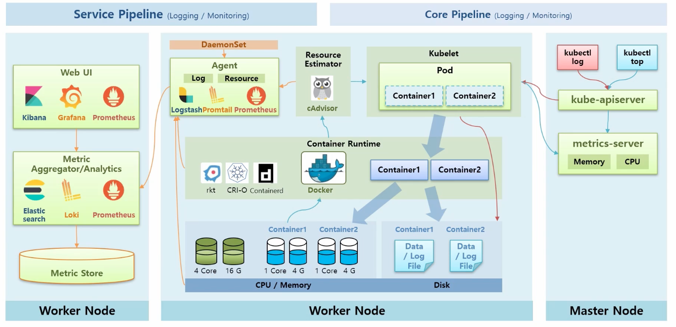 : k8s 아키텍처에서 말하는 Logging은 Log Data를 말하는 것이고, Monitoring은 Cpu, Memory같은 자원을 얘기합니다. 이런 기능들에 대해 k8s 자체적으로 제공되는 Core Pipeline이 있고 추가적으로 설치해서 기능을 강화할 수 있는 Service Pipeline이 있습니다.