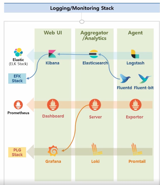 : 대부분 로깅와 모니터링 플러그인들은 위와 같은 스택을 가지고 있습니다. 대표적인 오픈소스로 Elastic사 에서 제공하는 솔루션입니다.