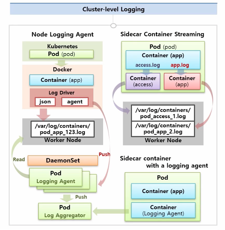 (3) Sidecar Container with a logging agent : Logging Agent를 SideCar 형태로 Pod안에 집어넣는건데 이렇게 하면 앱 컨테이너는 스탠다드 아웃으로 출력하지 않아도 이 Agent Container에 의해 로그가 수집되고, 그 로그는 수집 서버로 바로 보내주는 구조도 있습니다.