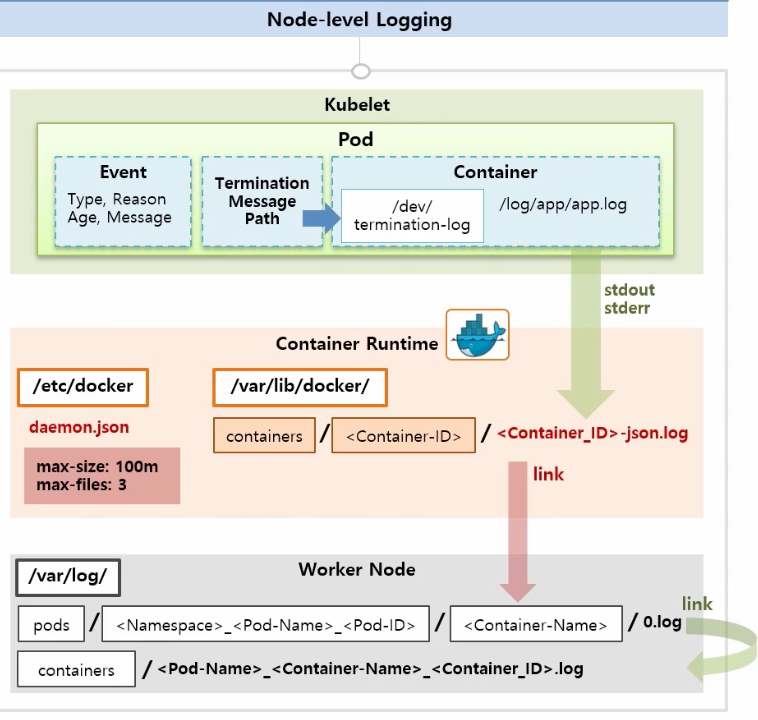 : 단일 노드 안에서 일어나는 로깅 구조입니다. 단일 노드에서 로그 파일이 생기는 구조를 보면 이렇게 kubelet, Docker, Worker Node 영역이 있습니다.