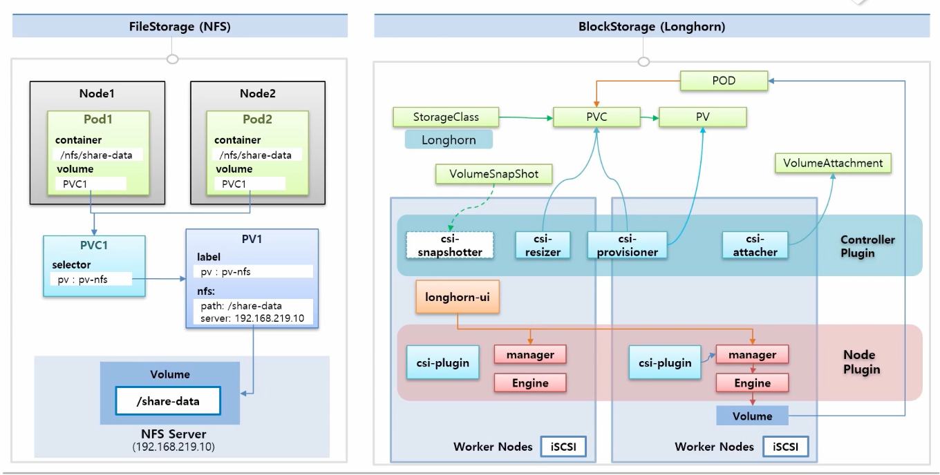 : PV를 만들어서 연결을 하고, selector와 Label을 이용해 PVC와 연결합니다. 이후 Node1, Node2에 각각 Pod를 만들어서 PVC와 붙인 후 FileStorage를 통한 파일 공유가 잘 되는지 실습을 해볼 수 있습니다.