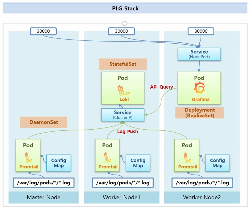 : 이는 마스터 노드와 워커 노드에는 앞에서 배운바와 같이 Pod별로 로그 파일이 쌓이고 있을 것이고, PLG 스택을 설치하면 DaemonSet으로 Promtail이라는 Agent가 모든 노드에 설치되고, ConfigMap으로 Promtail이 해당 Pod의 log Path를 읽도록 설정이 됩니다.