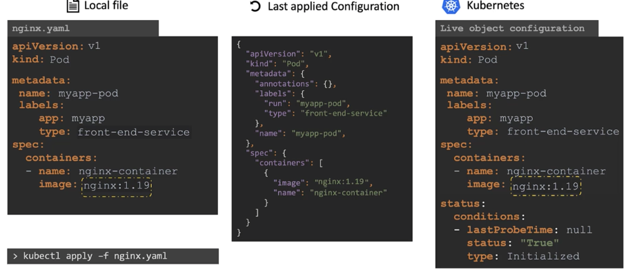 [Ex] 예를 들어 로컬 파일에서 이미지를 nginx:1.19 로 변경하고 apply 커맨드를 날리면, 먼저 클러스터에 있는 live object configuration 과 비교되어 차이점이 발견되고 업데이트 됨 -> last applied 파일도 이에따라 최신 값으로 업데이트 됨