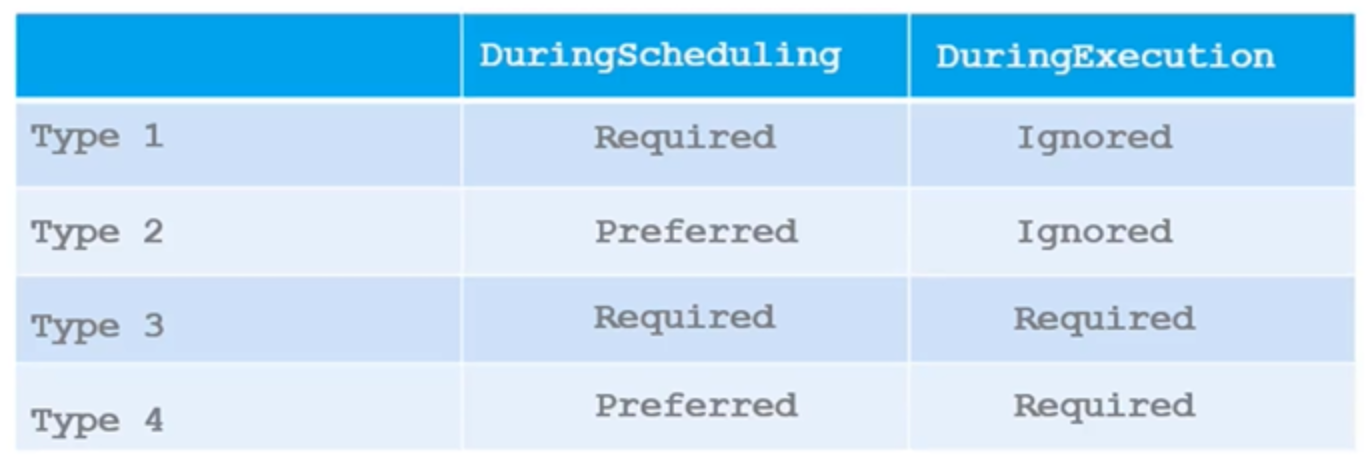 1) Required : Pod의 배치가 중요할 때 사용되며, 일치하는 노드가 없다면 Pod는 배치되지 않습니다.