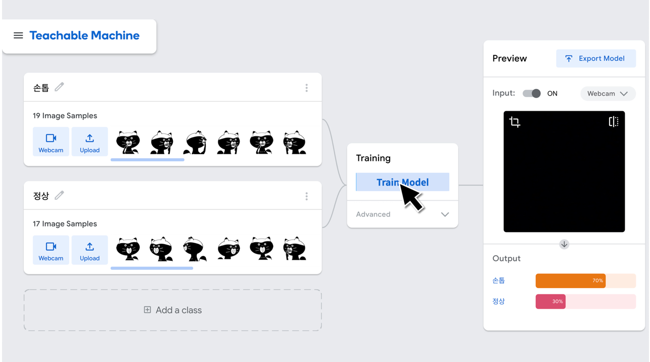 '손톱'이라는 이미지에 webcam을 누르면 자신의 노트북에 사진이 촬영되는데, 같은 방식으로 '정상' webcam에도 다른 평범한 모습을 찍는다. 이것은 컴퓨터에게 '손톱'과 '정상'에 해당하는 사진을 학습시키기 위해 자료를 모은 것이다. 즉 컴퓨터 학습할 교재를 만들어 준 것이다. 데이터를 충분히 입력했다면 학습을 시킬 수 있는데 Train Model버튼을 누른다. 이것이 기계에게 실제로 학습을 시키는 단계이다.