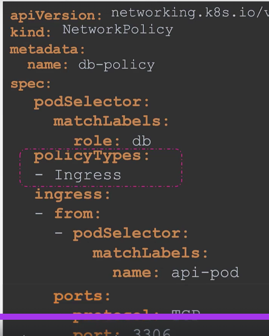 정책 유형에서 트래픽의 진입과 퇴장을 허용할지 혹은 둘 다 허용할지 명시하세요. 예로 위에서는 DB pod에 입력 트래픽만 허용하고 싶어요. 그래서 추가합니다. 다음 Ingress 규칙을 지정합니다. 그것이 API pod의 트래픽을 허용하고, 사용자는 Label, Selector를 이용해 API Pod를 다시 지정합니다. .yaml 파일 작성은 아래와 같습니다.