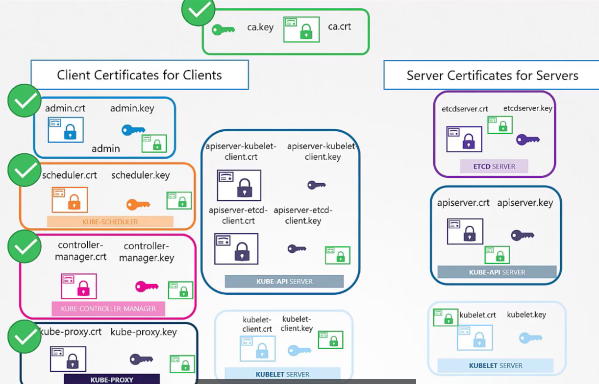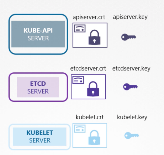 또한 다른 구성 요소는 Worker 노드에 있습니다. 바로 Kubelet 서버죠. 이도 위와 마찬가지로 인증서와 키를 가지고 있습니다.