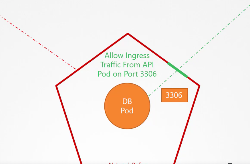 그런데 만약, 웹 서버와 데이터베이스 서버가 직접적으로 통신하지 않는 것을 원하면 어떻게 할까요? 여기서 네트워크 정책을 구현할 수 있습니다. Network Policy은 쿠버네티스 네임스페이스에 있는 또 다른 객체로 pod, ReplicaSet이나 서비스처럼 하나 이상의 pod에 네트워크 정책을 연결합니다. 아래의 경우 3306 포트 API pod에서만 Ingress 트래픽을 허용한다. 일단 이 정책이 생성되면 pod의 모든 트래픽을 차단하고 지정된 규칙에 부합하는 트래픽만 허용합니다.