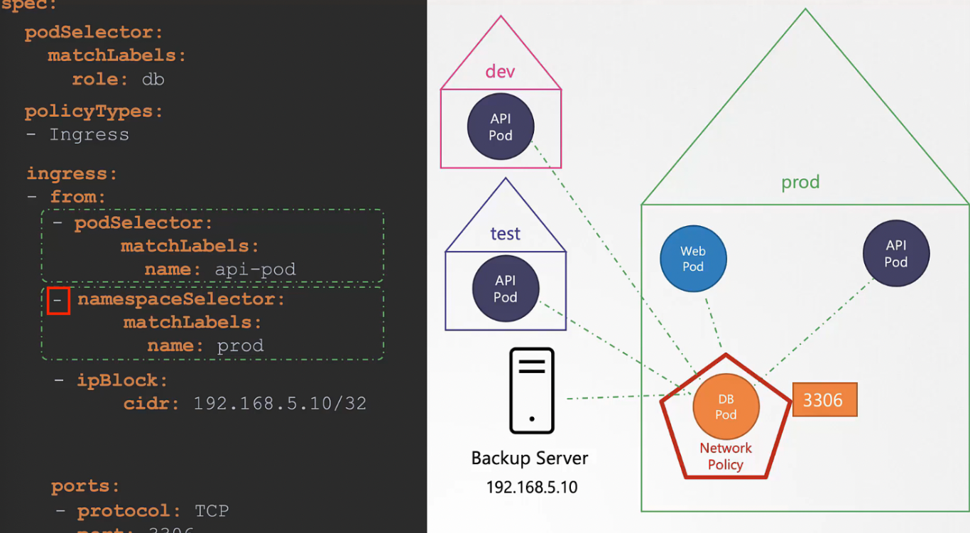 추가로 namespaceSelector만 지정할 수도 있다. 그럴 경우, 지정한 네임스페이스 내의 모든 파드만 데이터베이스 파드에 도달할 수 없다. 또한 ipBlock 영역을 통해 IP 주소를 지정하면 해당 IP의 개체가 DB 파드에 접근할 수 있다.