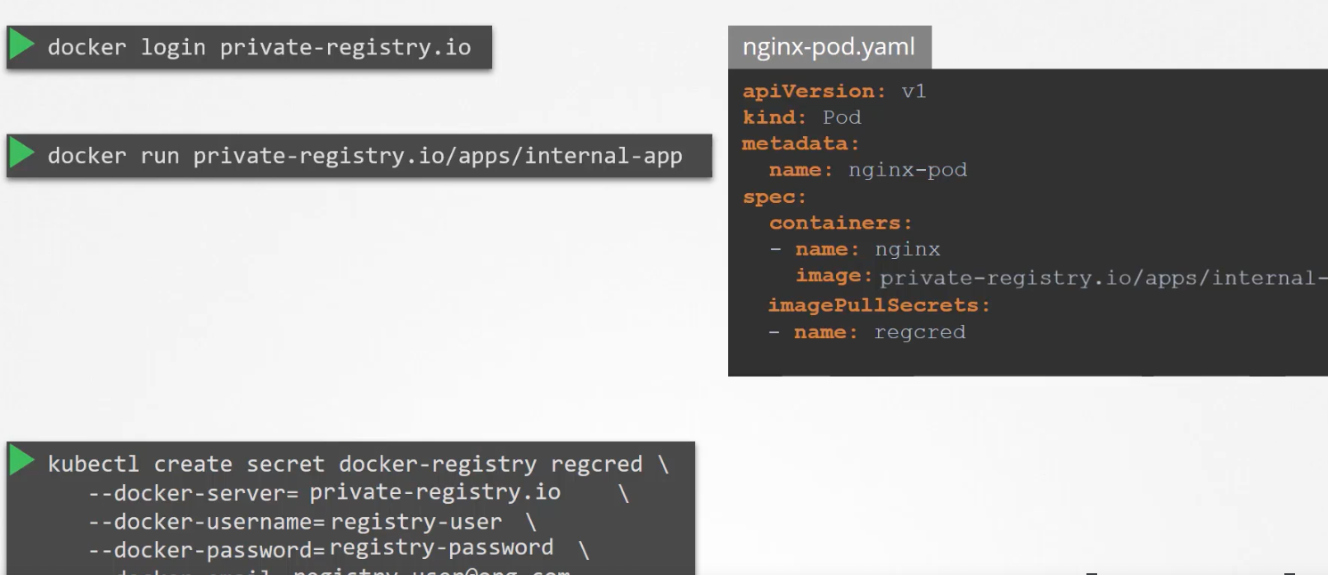이를 위해 먼저 자격 증명이 포함된 비밀 개체를 생성하죠. 도커 레지스트리의 비밀은 regcred라는 이름이죠. Docker 레지스트리는 Docker 자격 증명을 저장하기 위해 비밀리에 빌드된 유형이죠. 그런 다음 레지스트리 서버 이름을 지정합니다 레지스트리에 엑세스할 사용자 이름, 암호 사용자의 이메일 주소를요. 그런 다음 포드 정의 파일 안의 비밀을 지정합니다. imagePullSecrets 아래에요 포드가 생성되면 작업자 노드에 있는 쿠버네티스 혹은 쿠벨렛은 기밀에 있는 자격 증명을 이용해 이미지를 가져오죠.