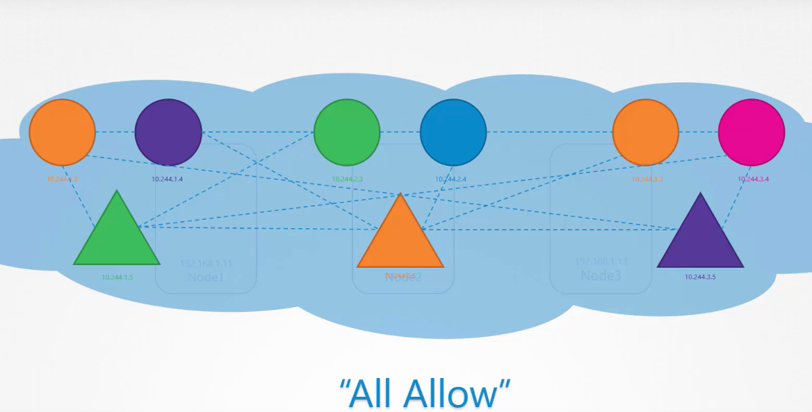 위를 예로, 네트워크 솔루션에선 모든 Pod가 가상 사설 네트워크에 있고, 쿠버네티스 클러스터 내 노드를 가로지르며 기본값으로 서로 닿습니다. 그 목적으로 구성된 IP나 pod 이름 또는 서비스를 이용해서요. 쿠버네티스는 기본값으로 모든 허용 규칙과 함께 구성됩니다. 어떤 Pod, 트래픽이 다른 pod, 또는 클러스터 내의 서비스가 가능하도록요.