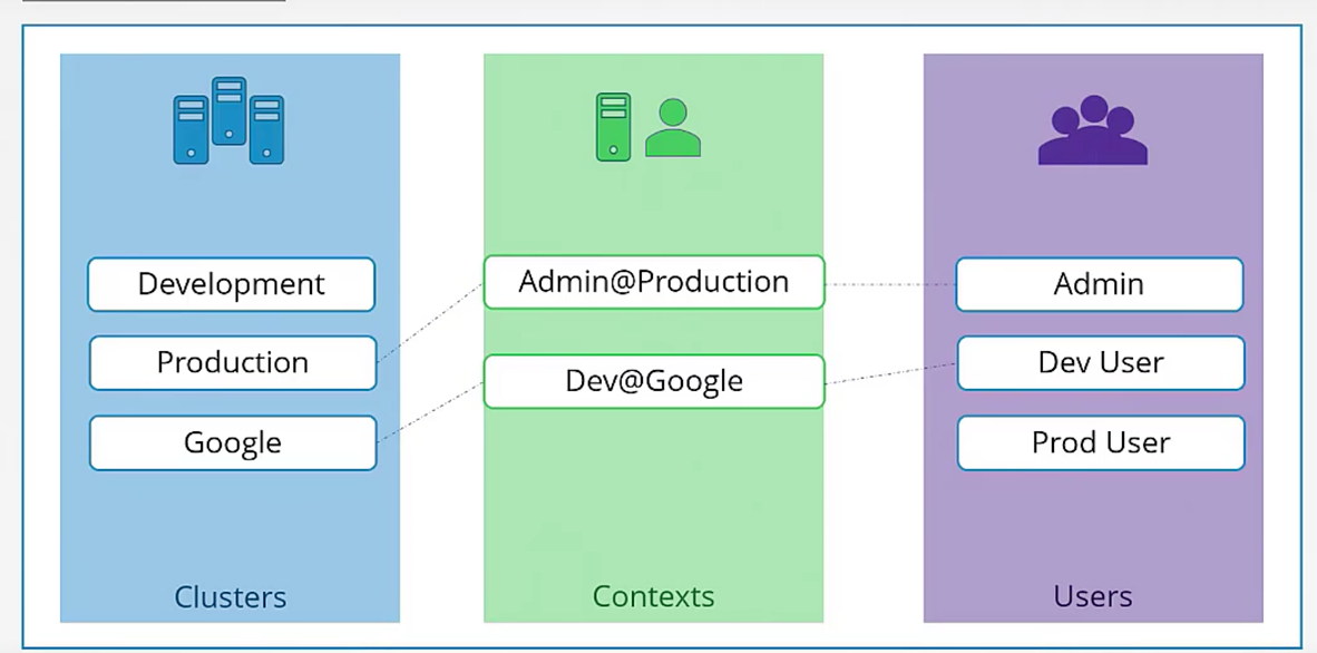 Clusters는 접근에 필요한 다양한 쿠버네티스의 클러스터입니다. 당신이 여러개의 클러스터를 개발 환경이나 테스트 환경, 혹은 서로 다른 조직, 혹은 클라우드 공급자등 가지고 있다고 가정한다면, Users는 이런 클러스터에 접근 권한이 있는 사용자 계정이죠. 관리자, 개발자 등을 말합니다. 이 Users들은 다른 클러스터에서 다른 권한을 가질 수 있는데, 마지막으로 이 2가지가 Contexts에서 만납니다.