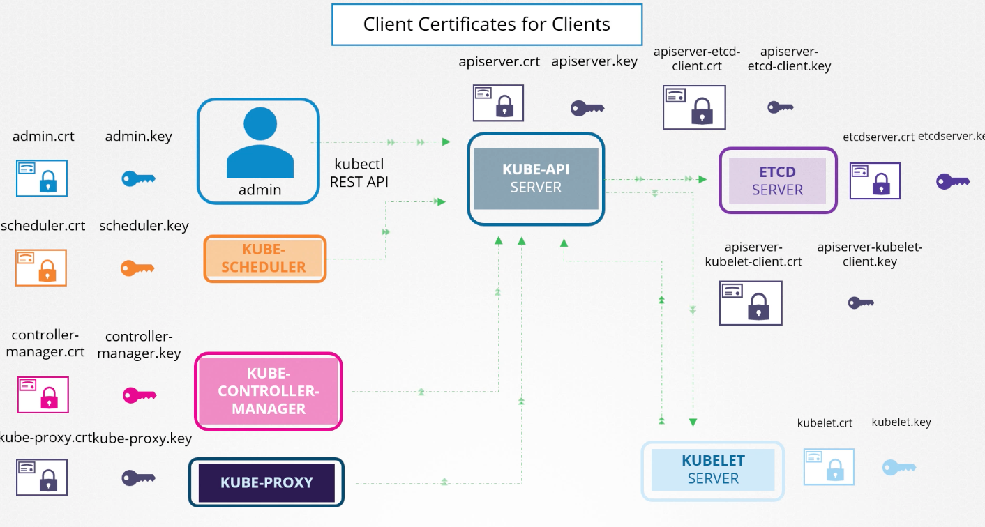 : kube-apiserver에 접근하는 클라이언트 우리, kube-apiserver에 접근하는 REST API 관리자입니다. 사용자는 kube-apiserver에 인증하려면 인증서와 키 페어가 필요하죠. 스케줄러는 kube-apiserver에 보고해서 스케줄이 필요한 pod를 찾습니다. 후에 다음 api 서버가 올바른 Worker 노드의 pod를 찾도록 하죠. 스케줄러는 kube-apiserver에 접근하는 클라이언트죠.