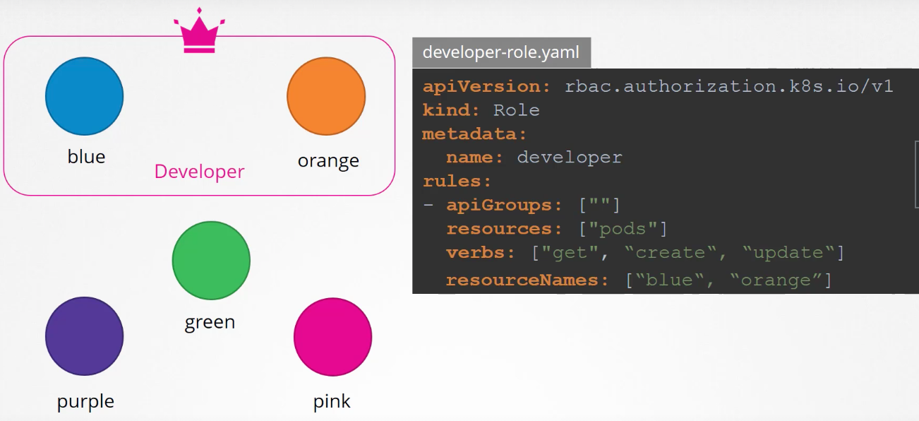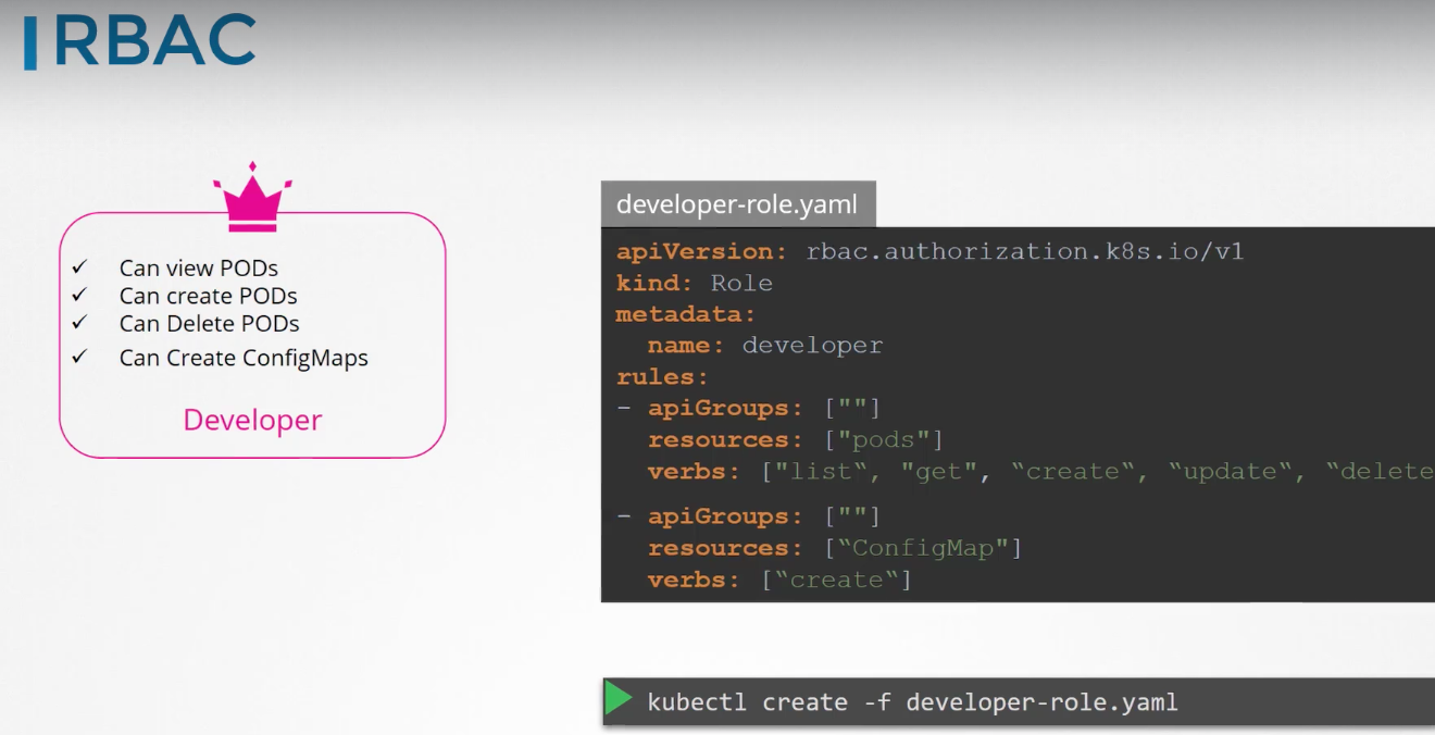 core 그룹은 apiGroups를 비워둘 수 있지만, 다른 그룹은 그룹 이름을 지정해야 합니다. 해당 역할에게 제공하고 싶은 것에는 resources를 작성해주면 됩니다. 취할 수 있는 행동은 verbs를 통해 작성할 수 있습니다. 역할 하나에 여러 규칙을 추가할 수 있고, 명령은 아래와 같습니다. > kubectl create -f developer-role.yaml
