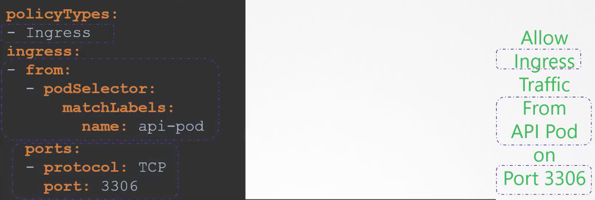 그런데 만약, 웹 서버와 데이터베이스 서버가 직접적으로 통신하지 않는 것을 원하면 어떻게 할까요? 여기서 네트워크 정책을 구현할 수 있습니다. Network Policy은 쿠버네티스 네임스페이스에 있는 또 다른 객체로 pod, ReplicaSet이나 서비스처럼 하나 이상의 pod에 네트워크 정책을 연결합니다. 아래의 경우 3306 포트 API pod에서만 Ingress 트래픽을 허용한다. 일단 이 정책이 생성되면 pod의 모든 트래픽을 차단하고 지정된 규칙에 부합하는 트래픽만 허용합니다.