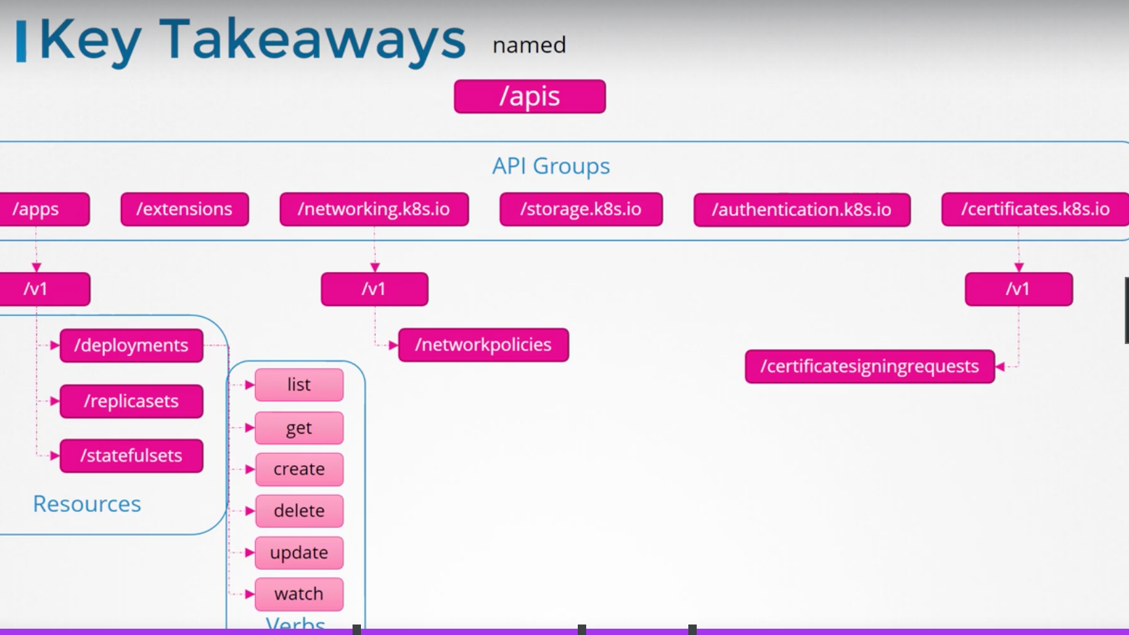 : 쿠버네티스 API는 목적에 따라 여러 그룹으로 그룹화됩니다. 예로 /api, /healthz, /logs 등 있습니다. API는 /api, /apis로 나뉘는데 core와 named 그룹으로 나뉩니다.