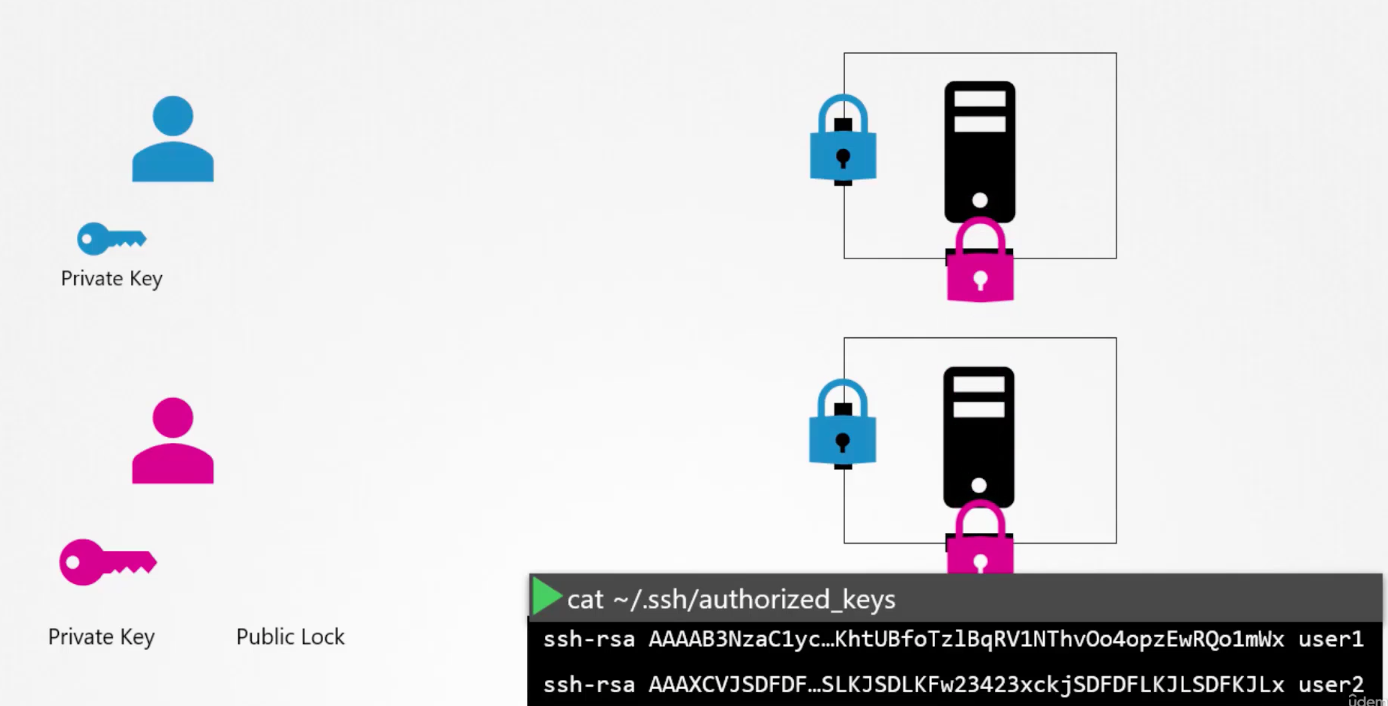 공공 자물쇠를 사용해 잠긴 것은 제외하고, 보통 서버의 SSH 인증키 파일에 공용키로 엔트리를 추가합니다. 만약 다른 사용자가 당신의 서버에 접속해야 한다면, 그들도 똑같이 개인키와 공용 키를 쌍으로 따로 만들 수 있습니다. 서버에 접속할 수 있는 유일한 사람이니까 그들에게 추가 문을 만들어 공용 잠금장치로 Lock할 수 있습니다. 모든 서버에 복사하면, 다른 사용자가 개인키를 이용해 서버에 접속할 수 있죠.