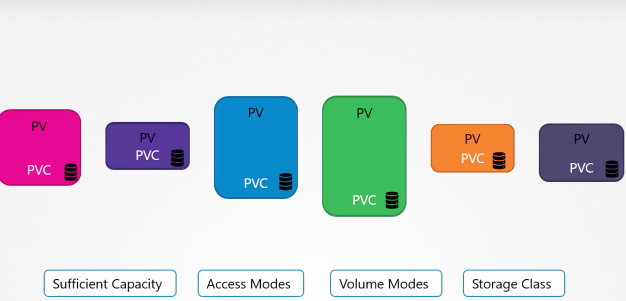 모든 persistent volume claims은 단일 persistent volume에 바인딩됩니다. 바인딩 프로세스 중에 Kubernetes는 claims에서 요청한 대로 용량이 충분한 persistent volume을 찾으려고 합니다. 여기에는 Access Modes, Volume Modes, Storage Class, Sufficient Capacity 등과 같은 기타 모든 요청 속성도 반영이 됩니다.