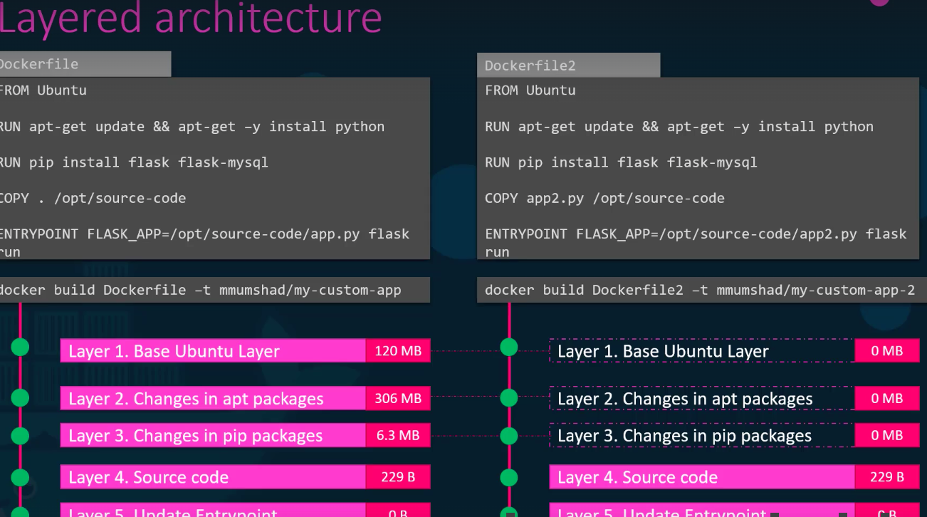이를 위해서 계층 구조를 이해하면 좋습니다. 도커는 이미지를 구축할 때 Layered architecture에 이것을 사용합니다. 도커 파일의 각각 지시 사항 명령은 도커 이미지에 새 레이어를 만듭니다. 이전 레이어에서 변경된 것만요. 위를 예로 3개의 이전 계층을 재사용해 최신 소스 코드를 빠르게 업데이트 하고, 응용 프로그램 이미지를 재구축합니다.