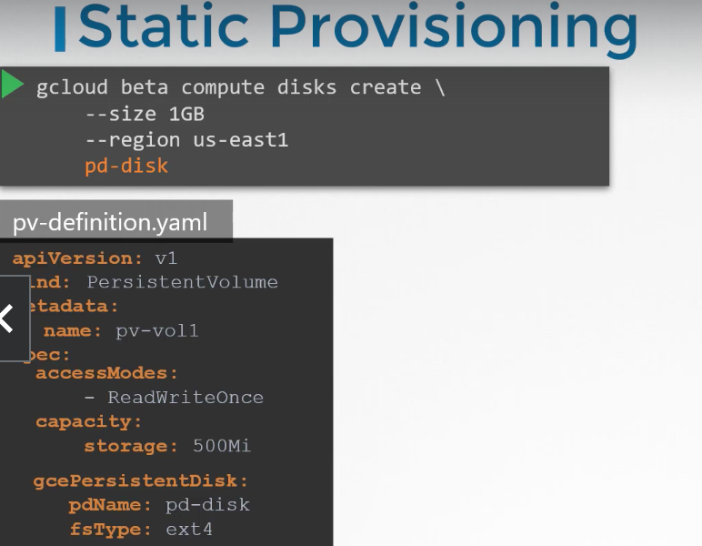 1) static Provisioning : 여기서 문제는 이 PV가 생성되기 전에 Google Cloud에 디스크를 생성해야 한다는 것입니다. 애플리케이션에 스토리지가 필요할 때마다 먼저 Google Cloud에서 디스크를 수동으로 프로비저닝한 다음 생성한 디스크와 동일한 이름을 사용하여 persistent volume definition 파일을 수동으로 생성해야 합니다. 이를 static provisioning volume이라고 합니다.