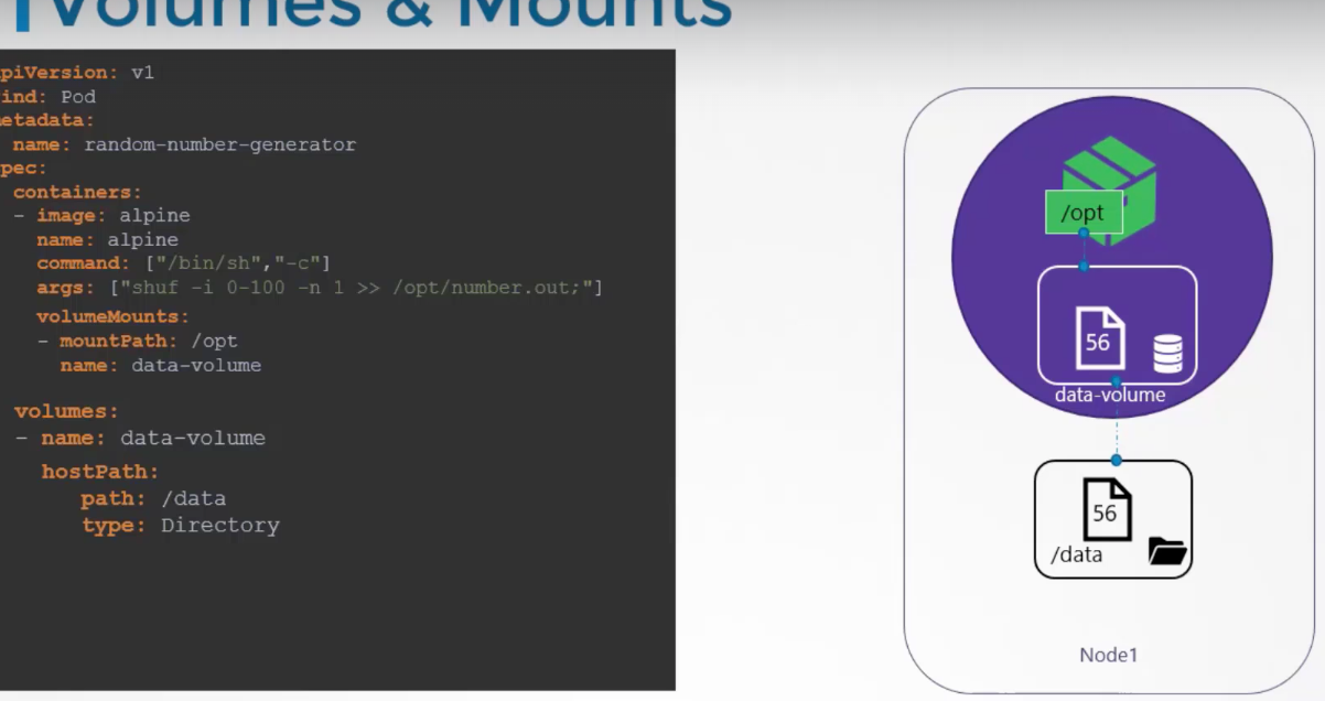 노드에 볼륨을 생성합니다. (보라색 원) 간단하게 구성해 호스트에 있는 디렉터리를 사용하도록 하겠습니다. 아래 경우에는 호스트에서 경로를 지정합니다 /data 볼륨에 생성된 파일은 Node1의 디렉터리 /data에 저장됩니다. 볼륨이 생성되면 컨테이너에서 이에 접근하기 위해 컨테이너 내부의 디렉터리에 그 볼륨을 마운트합니다. 각 컨테이너에서 볼륨 마운트 필드를 사용해 디렉터리에 데이터 볼륨을 마운트합니다. 이는 컨테이너 내부의 OPT입니다. 임의 숫자는 이제 컨테이너 안에 있는 /opt에 작성됩니다. 데이터 볼륨에 있는거고,