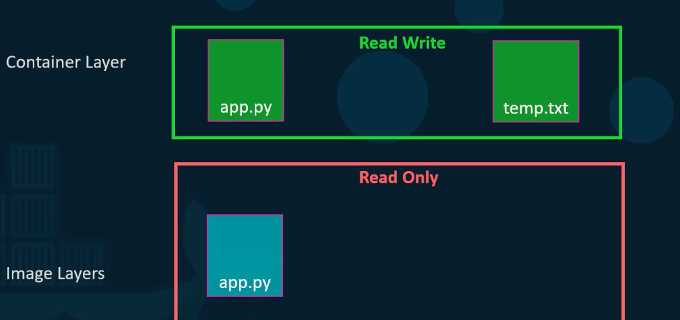 새로 생성된 컨테이너에 로그인하고, temp.txt라는 새 파일을 생성한다고 말하면 컨테이너 레이어에 읽기 및 쓰기가 가능한 해당 파일이 생성됩니다. 그렇다면 Image Layers의 파일은 수정할 수 없나요? 아니요, 수정할 수 있지만 수정된 docker 파일을 저장하기 전에 Container Layer의 파일 복사본을 자동으로 만들고, Read Write 계층인 Container Layer에 앞으로 수정사항이 생길겁니다. 이후의 모든 수정은 Read Write 계층에서 파일을 수정하게 되고, 이것을 copy on mechanism이라고 합니다. 이미지 레이어가 읽기 전용이라는 것은 이러한 레이어의 파일이 이미지 자체에서 수정되지 않음을 의미합니다. 따라서 이미지는 docker build 명령을 사용하여 이미지를 다시 빌드할 때까지 항상 동일하게 유지됩니다.