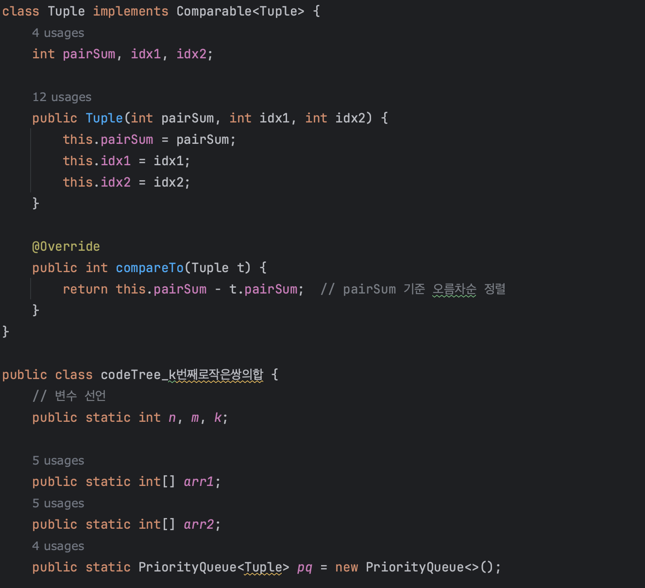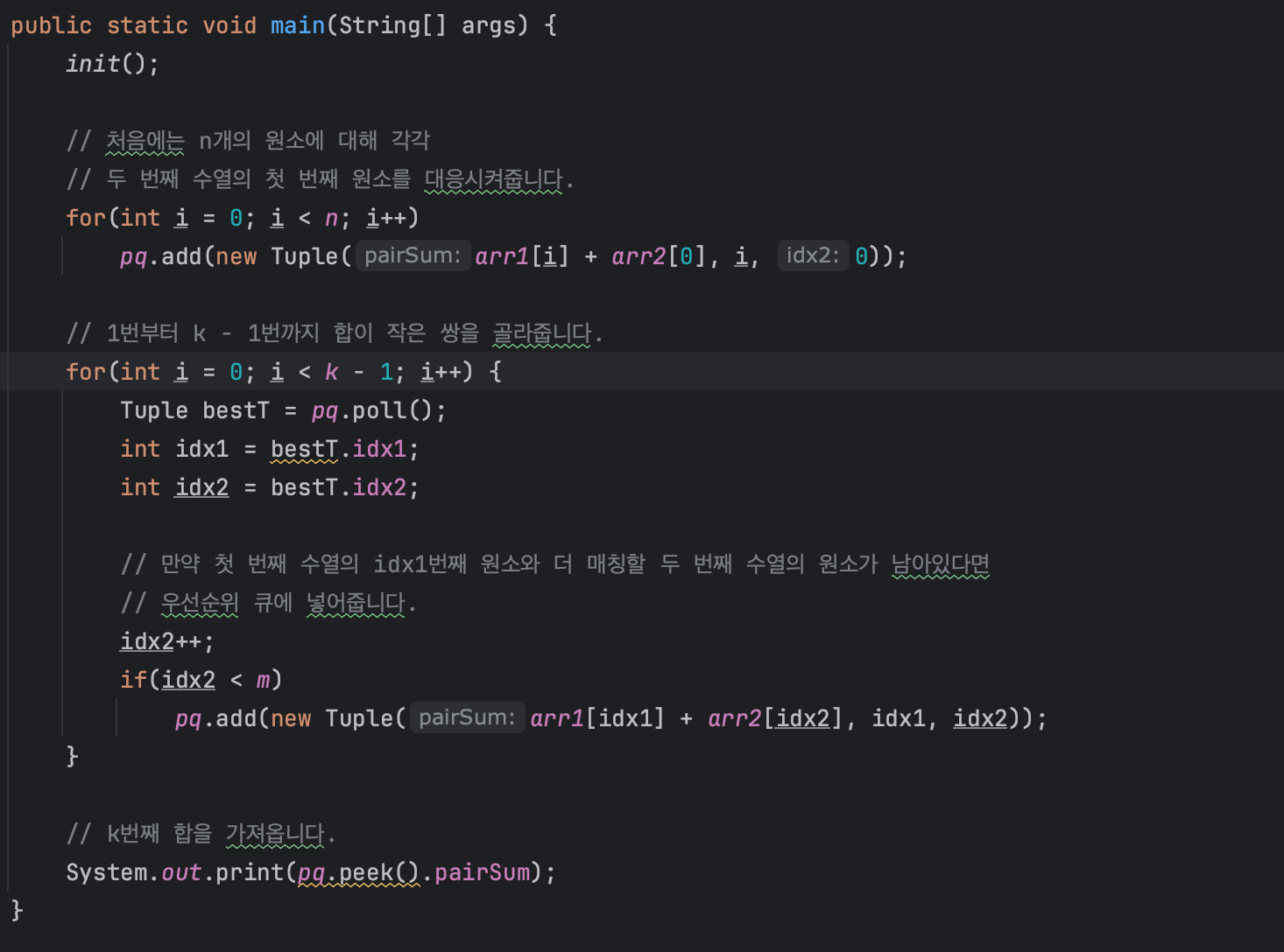 배운점 : arr1, arr2 배열의 원소들을 정렬해서 미리 배열의 원소들의 합을 구할 때 최소를 구하고자 한다. 이해가 안되었던 로직은 아래와 같다. pq는 두 배열 원소의 합 쌍을 기준으로 오름차순 정렬한 PriorityQueue이다.