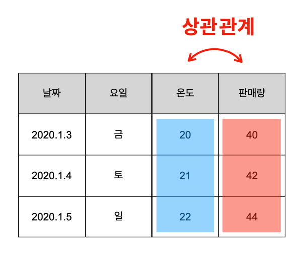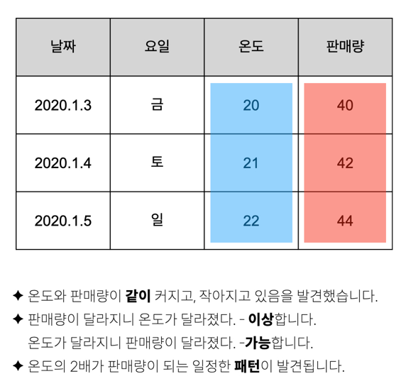 좀 더 자세히 살펴보면 온도와 판매량 사이에 보다 미묘한 관계가 있는 것을 관찰할 수 있습니다. 옆의 사실을 종합하면 '온도'는 '원인'이고, '판매량'은 '결과'라고 할 수 있습니다. 이렇게 각 열이 원인과 결과의 관계일 때 인과관계가 있다고 합니다. 상관관계와 인과관계는 비슷한 듯 하지만 중요한 차이가 있는데, 상관관계가 인과관계를 포함한다는 것입니다. 즉 모든인과관계는 상관관계입니다.