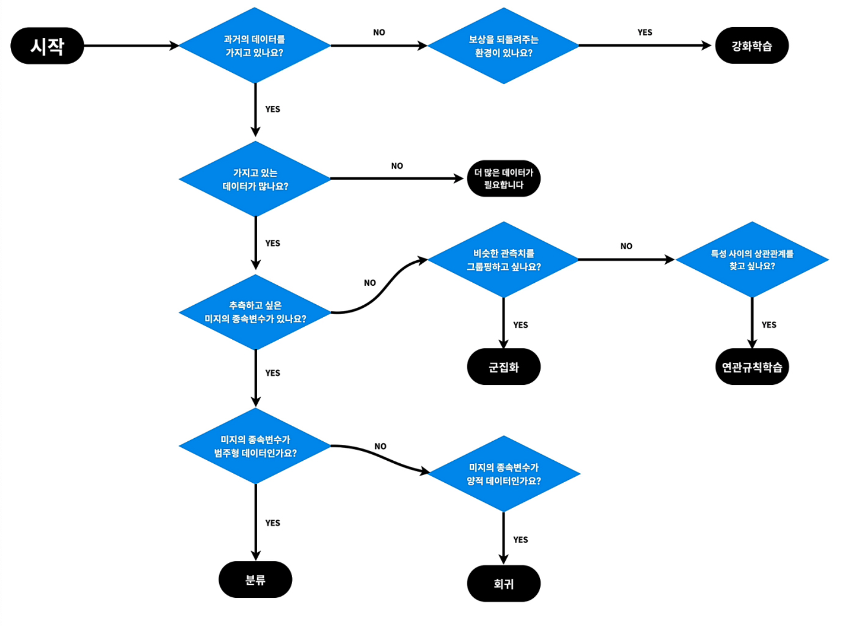 위의 지도가 모든것을 해결해주지 않습니다. 현실에 적용되는 것들은 훨씬 어렵고 복잡하기 때문입니다. 그동안 배웠던 것만을 기반으로 만든 것입니다. 지난 6일간 큰 그림을 멀 리버 보듯 가볍게 Machine Learning에 대해 배워보았습니다. 여기서 더 나아가 자신의 필요한 부분이 있다면 알아서 검색하고, 지식을 늘려나가겠지요?