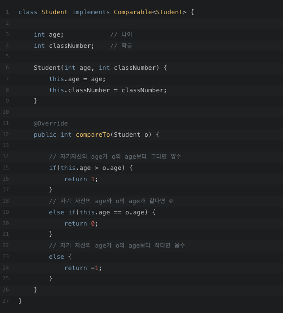 이제 compareTo 메소드를 구현해야 할 것이다. 만약 나이를 기준으로 비교(대소 관계)를 하고자 한다면 어떻게 하면 될까?