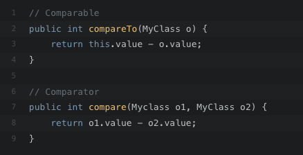 좀 더 구체적으로 말하자면 Comparable의 compareTo는 선행 원소가 자기 자신이 되고, 후행 원소가 매개 변수로 들어오는 o 가 되는 반면에, Comparator의 compare는 선행 원소가 o1이 되고, 후행 원소가 o2가 된다.