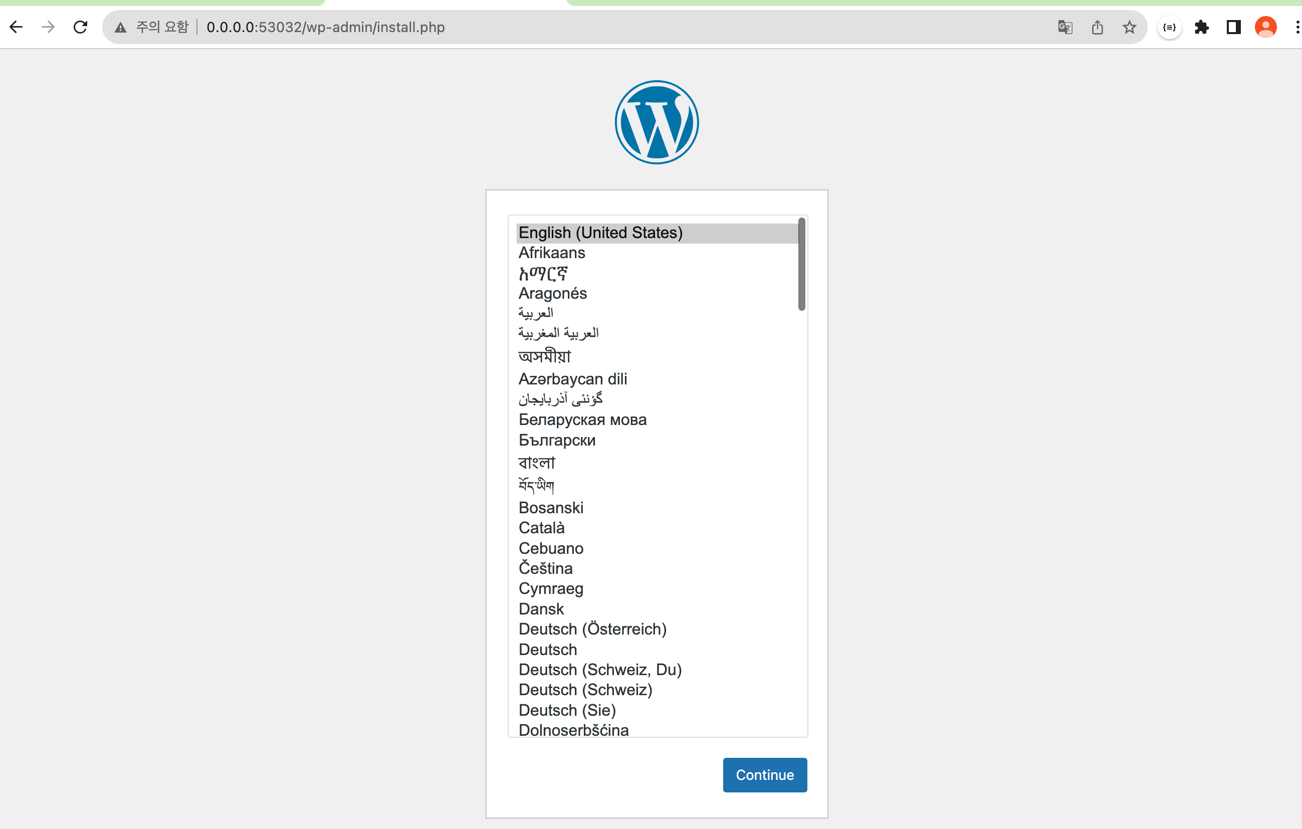 내 wordpress 웹 서버 호스트 IP는 0.0.0.0이고, 포트는 53032에 컨테이너의 80번 포트가 바인딩되었다.