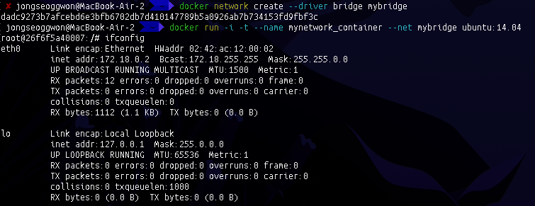 위와 같이 사용자 정의 네트워크는 disconnect, connect로 컨테이너에 유동적으로 붙이고 뗄 수 있다. 네트워크의 서브넷, 게이트웨이, IP 할당 범위 등을 임의로 설정하려면 --subnet, --ip-range, --gateway 옵션을 추가하면 된다. 단 --subnet과 --ip-range는 같은 대역이어야 한다.