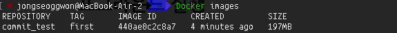 commit_test 이름에 first라는 태그로 이미지가 생성되었습니다. 이번에는 commit_test:first 이미지로 새로운 이미지를 생성해 봅시다. commit_test:first 이미지로 컨테이너를 생성한 뒤 second라는 파일을 추가해 commit_test:second라는 이미지를 새롭게 생성합니다.