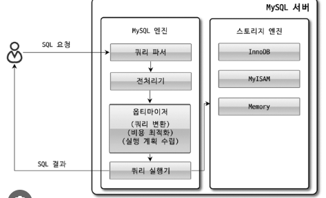 MySQL 엔진 : 클라이언트로부터 접속 및 쿼리 요청을 처리하는 커넥션 핸들러와 SQL 파서 및 전처리기, 쿼리의 최적화된 실행을 위한 옵티마이저가 중심을 이룬다. Mysql은 표준 SQL 문법을 지원하기 때문에 표준 문법에 따라 작성된 쿼리는 타 DBMS와 호환되어 실행될 수 있다.