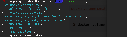 한번 볼만한 정보는 CAdvisor 생성할 때 옵션으로 설정한 호스트 볼륨 공유 부분인데, CAdvisor는 이렇게 많은 정보를 어떻게 사용자에게 보여줄 수 있는지 생각해봅시다. 답은 도커 데몬의 정보를 가져올 수 있는 호스트의 모든 디렉터리를 CAdvisor 컨테이너에 볼륨으로 마운트했기 때문입니다. /var/run에는 도커를 로컬에서 제어하기 위한 유닉스 소켓이 있고, /sys에는 도커 컨테이너를 위한 cgroup 정보가 저장돼 있으며, /var/lib/docker에는 도커의 컨테이너, 이미지 등이 파일로 존재합니다.