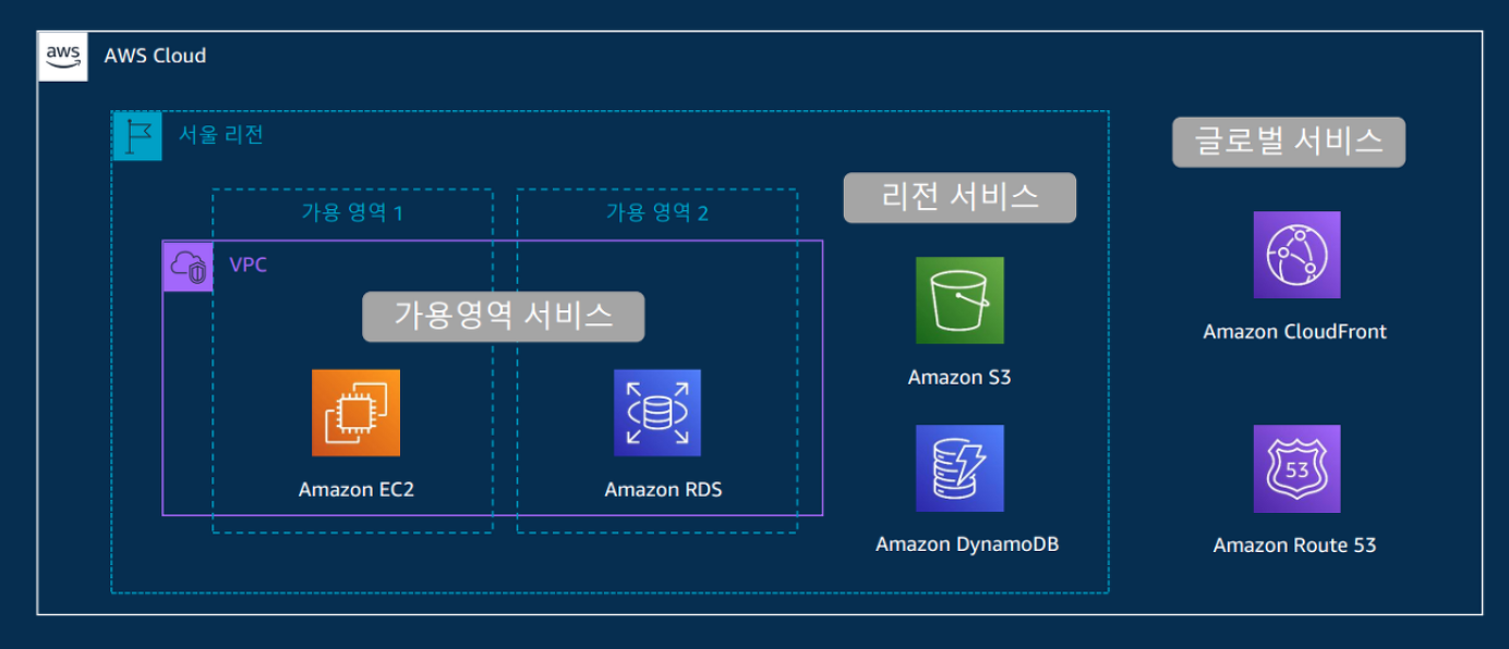 AWS 서비스는 실행 위치에 따라 위 그림 3가지 유형으로 나뉜다. AZ 서비스는 VPC 안에서, 그 외의 서비스는 VPC 밖에서 실행된다.