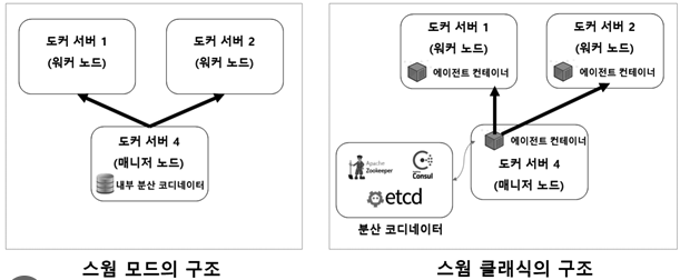 스웜 클래식과 스웜 모드의 다른 차이점은 분산 코디네이터, 에이전트와 같은 클러스터 툴이 별도로 구동되느냐 입니다. 여러개의 도커 서버를 하나의 클러스터로 구성하려면 각종 정보를 저장하고 동기화하는 분산 코디네이터, 클러스터 내의 서버를 관리하고 제어하는 매니저, 각 서버를 제어하는 에이전트가 반드시 있어야 합니다.