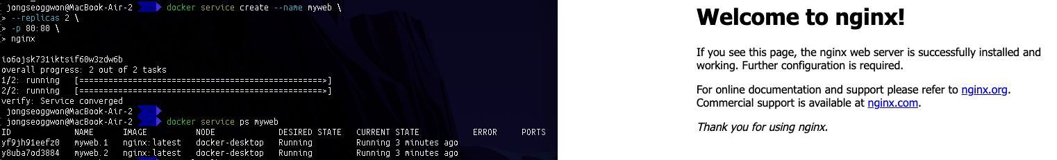 잘 들어가지는 모습을 확인할 수 있습니다. (저는 http:localhost로 들어가서 확인했습니다~) 그렇다면 서비스 내의 Nginx 컨테이너를 늘리면? docker service scale 명령어를 이용해 레플리카셋의 수를 늘리거나 줄일 수 있습니다. 컨테이너가 각 컨테이너들이 호스트의 80번 포트에 연결된 것이 아니라 실제로는 각 노드의 80번 포트로 들어온 요청을 위 컨테이너 중 1개로 리다이렉트 하기 때문입니다.