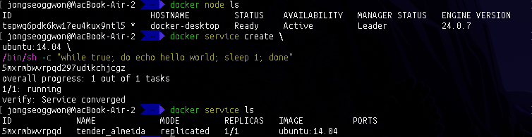 서비스를 사용하기 위한 명령어는 docker service로 시작합니다. 서비스를 생성하려면 docker service create 사용하며, ubuntu:14.04 이미지로 서비스 내 컨테이너를 생성하며 컨테이너가 시작할 때 실행할 명령어로 'hello world' 출력하는 셀 명령어를 설정하겠습니다.