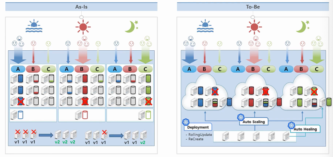 한 회사에서 3개의 서비스를 오픈하고 있다. 이른 아침에 A서비스 접속량이 높고, 이를 위해 세대의 서버 자원량이 필요합니다. B,C는 이 시간대에 접속량이 낮지만, 정오가 되면 B서비스 접속량이 높고, 밤이 되면 C서비스 접속량이 높아짐을 예로 들어볼게요. A 서비스의 경우 다른 시간대에 트래픽이 적더라도 아침 시간에 서비스 운영을 위해서 어쩔 수 없이 3대의 서버가 할당되어 있고, 다른 서비스도 마찬가지라 결국 9대의 서버가 필요합니다.