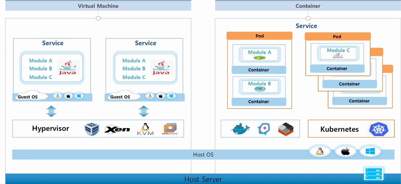 한 서버에는 기본적으로 어떤 운영체제가 됐건 호스트 OS가 올라갑니다. VM의 경우 호스트 OS 위에 VM을 가상화시켜주기 위해 여러 하이퍼바이저들이 있다. 이런 것들을 사용해서 또 원하는 운영체제로 게스트 OS를 올려서 여러 VM을 만들 수가 있다.