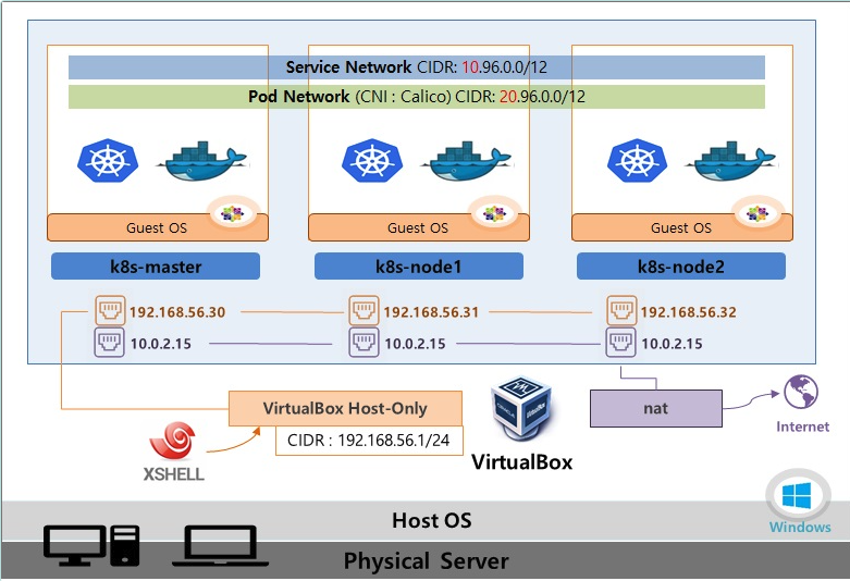 그리고 Host-Only 네트워크는 각각의 VM에 192.168.56.30, 192.168.56.31, 192.168.56.32로 배정되었습니다. 각각의 VM에 이 IP 들을 할당해줘서 VM간에 통신을 하는 역할과 그리고 Host OS에서 XSHELL을 통해 IP로 접속을 하게 해주는 역할을 합니다.