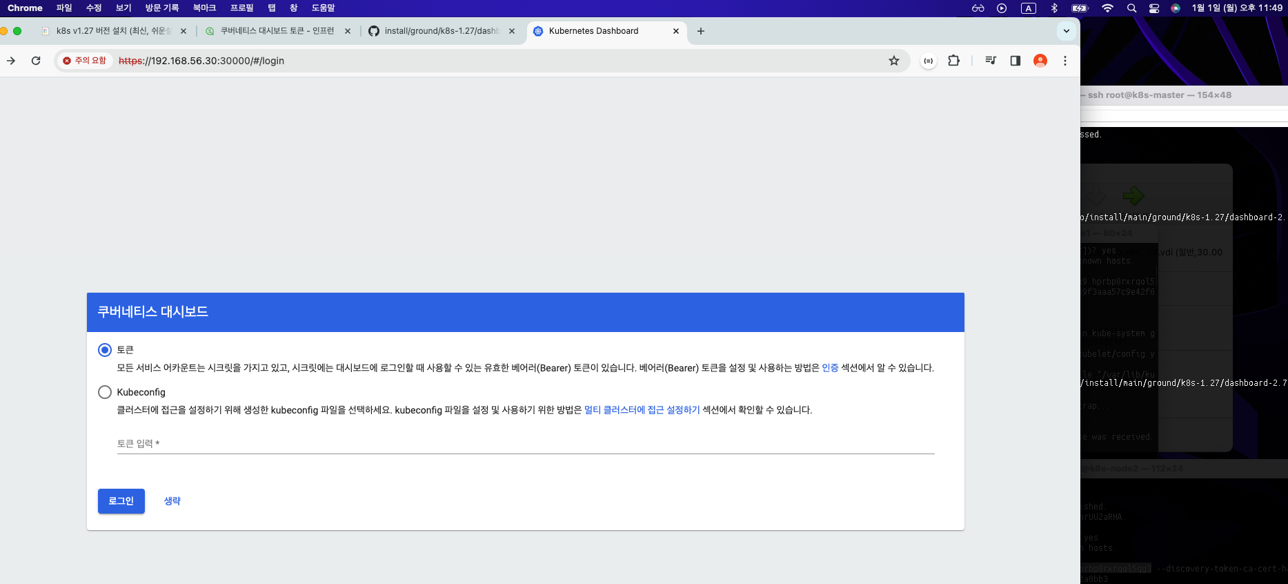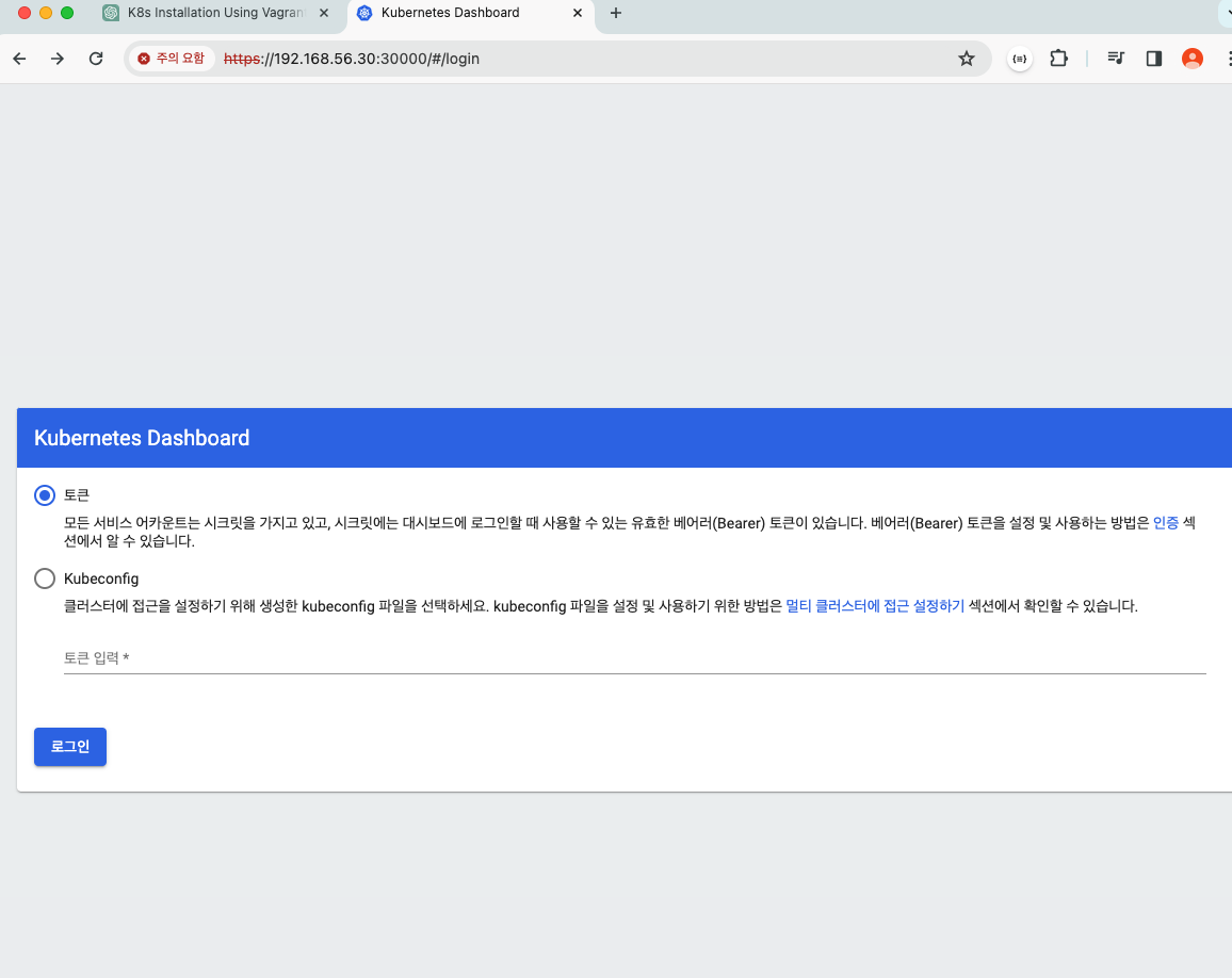6. 대시보드 접근 : Host OS에서 웹 브라우저를 이용해 클러스터 Dashboard에 접근합니다. 원래 Dashboard를 사용하려면 추가적인 설정이 필요한데요, 위에 Dashboard Pod가 존재해서 바로 접근이 가능하더라구요. 그런데... 실습과 다르게 아래에는 skip 표시가 없었어요. ㅂㄷㅂㄷ..