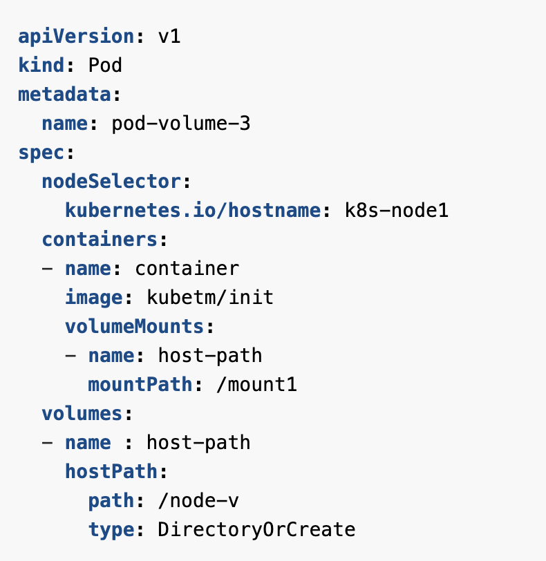 yaml 내용은 이 Pod는 Node1에 생성할거고, 이 컨테이너에서 접근할 mountPath는 mount1이고, mount 할 볼륨의 이름은 host-path입니다. 그래서 host-path에 정의되어 있는 볼륨을 확인하면 hostParh 아래 경로와 tpye이 있습니다. type의 DirectoryOrCreate는 만약 노드에 해당 Path가 없으면 직접 생성하겠다는 것 입니다.