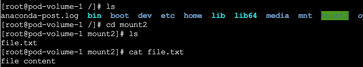 해당 쉘은 pod-volume-1의 컨테이너 1입니다. 컨테이너1에 mount1이라는 폴더가 만들어진 것을 확인할 수 있고, 여기에 file.txt라는 파일을 만들어 본 후 컨테이너 2에서 확인해보겠습니다. 그러면 아래와 같이 컨테이너2에 mount2로, 컨테이너1에서 만든 file.txt 존재를 확인할 수 있습니다. 그리고 pod-volume-1을 삭제 후 재생성하면 mount1안에 존재했던 txt파일은 날아가게 됩니다.